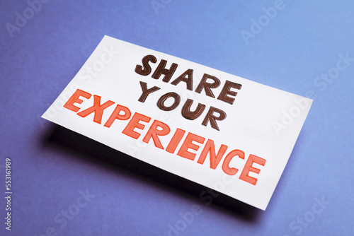 Card with motivational phrase Share Your Experience on blue background