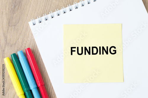 card with text Funding on a notebook on the table, next to it are colored markers. Business concept.