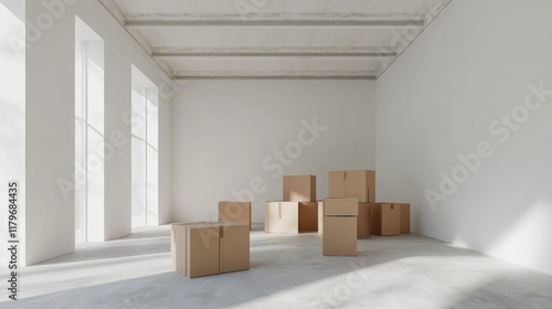 Cardboard Moving Boxes in Empty Room with Bright Light and Neutral Tones Ideal for Relocation and Packing Concepts