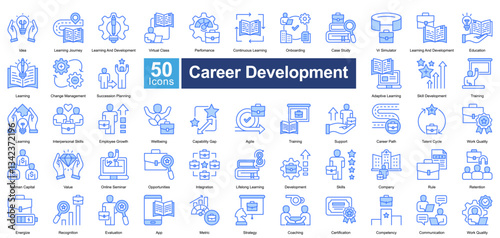 Career Development icon set in blue color style, featuring 50 icons on training, skill growth, employee success, and career progression. Ideal for HR, education, and professional coaching.
