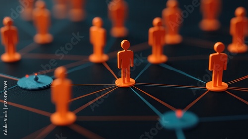 Career development thrives through professional networking, mentorship, and strategic growth. Network of orange figures connecting in a digital space.