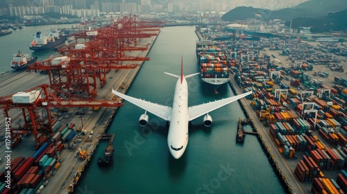 Cargo aircraft and container ship side by side in a busy industrial port, symbolizing integrated global supply chains and efficient logistics