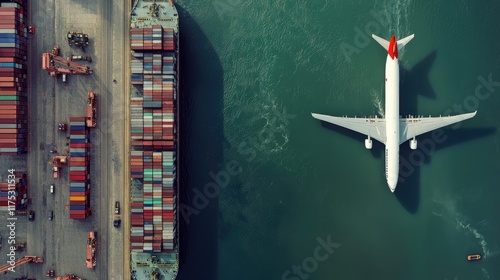 Cargo aircraft and container ship side by side in a busy industrial port, symbolizing integrated global supply chains and efficient logistics