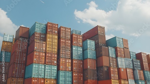Cargo Containers Stacked High Against a Blue Sky with Clouds