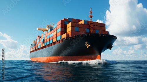 Cargo Ship Sailing on Blue Ocean with Stacked Containers