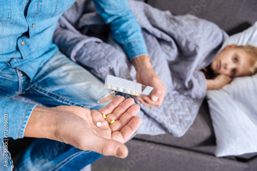 Caring father holding pills for his ill son