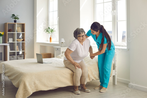 Caring for the elderly. Female caregiver who cares for an elderly woman in a nursing home helps her get out of bed. Concept of support and daily life in a nursing home