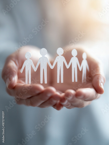 Caring hands holding paper cutout figures of people connected in unity symbolizing support, community, and togetherness in a soft light background