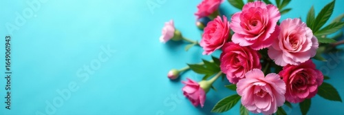 Carnation bouquet on bright blue table, Mother's Day gift , flowers, cheerful, close up