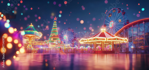 Carousel at night, merry go round, carousel in the park. Holiday decorated amusement park fair ground carousel at night with Christmas lights
