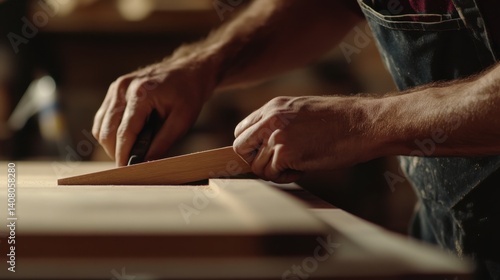 Carpenter cutting precise joints for furniture in a workshop. Featuring craftsmanship and focus