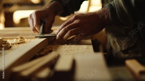 Carpenter cutting wood for a custom furniture piece. Featuring attention to detail and skill