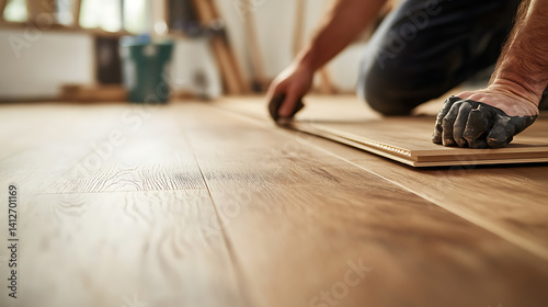 Carpenter cutting wood planks for flooring installation. Featuring wood cutting for flooring