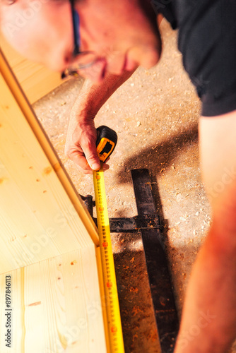 Carpenter measuring wooden plank using tape measure in workshop