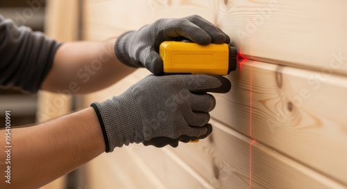 Carpenter using laser level on wood wall precise measurement tools