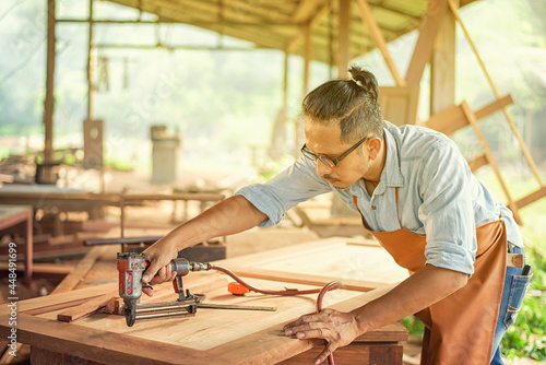 Carpenter Woodwork and furniture making in carpentry workshop