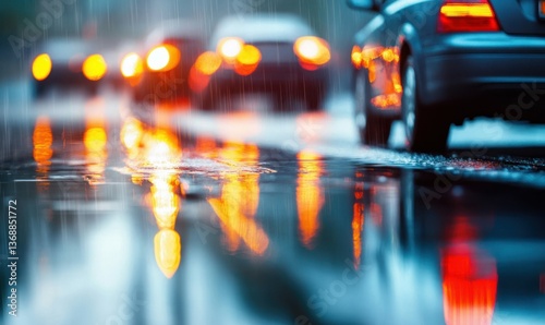 Cars create colorful reflections on a rain-soaked city street, moving through the blurry downpour.