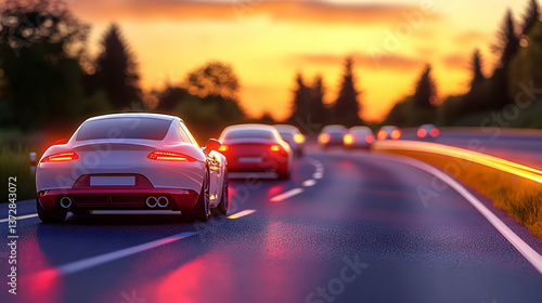 Cars Driving on the Road at Sunset with Colorful Sky and Trees in a Lush Landscape at Dusk with Beautiful Horizon Light