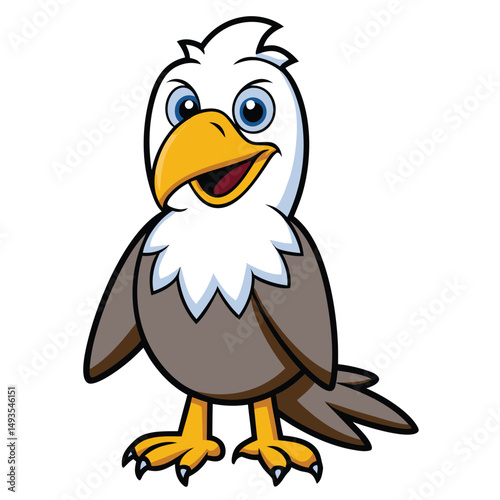 Cartoon bald eagle standing with white head, brown feathers, and yellow beak looks happy