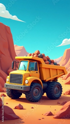 Cartoon beige truck carrying rocks on a solid colorful background, rock truck, simple lines