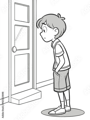 Cartoon Boy Standing by Door, Looking Sad. Black and White Illustration of a Pensive Child in Shorts and T-shirt, Graphic Novel Style.