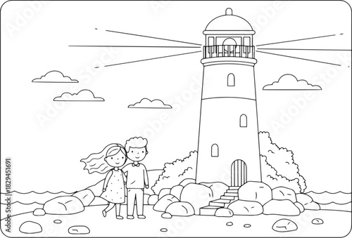 Cartoon couple standing near a lighthouse: vector coloring page