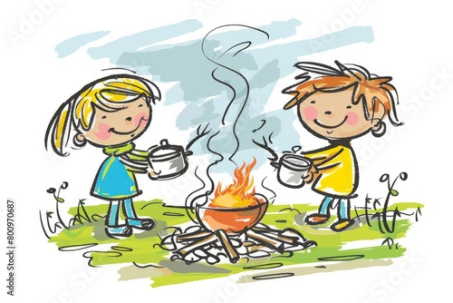 Cartoon cute doodles of children learning to build a campfire and cook delicious meals outdoors, with pots and pans bubbling over the flames, Generative AI