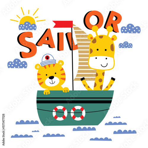 Cartoon giraffe and tiger sailing in boat with lifebuoys under sunny sky and clouds with bold sailor text. Friendship voyage concept