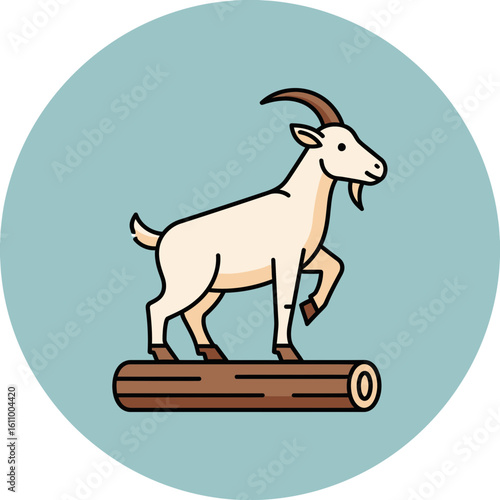 Cartoon goat stands on a log within a light blue circle background.