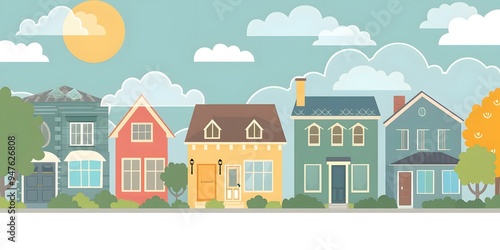 Cartoon Illustration of a Row of Colorful Houses with a Blue Sky and Clouds