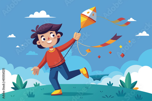 Cartoon illustration of a young boy smiling while flying a colorful kite in a blue sky with white clouds, Flying kite Customizable Cartoon Illustration