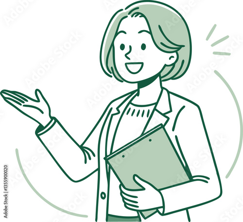 Cartoon illustration of a young woman reading a book, writing in a notebook, and holding a folder, with a laptop and business-related elements in a school or office setting
