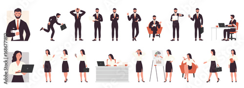 Cartoon isolated busy businessman and businesswoman in office outfit, corporate managers working and talking phone, running with briefcase and walking. Business people pose set vector illustration.
