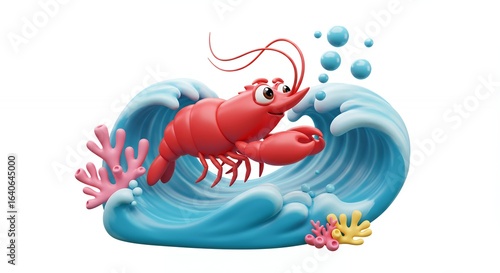 Cartoon lobster riding a wave with coral reef