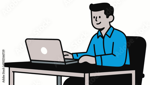 Cartoon man sitting at office desk working on a laptop, black outline and solid blue fill, white background