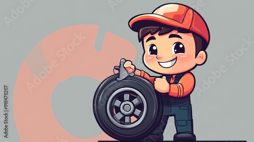 Cartoon Mechanic Holding a Tire