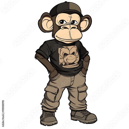 Cartoon monkey in a graphic tee and cargo pants on a white background.