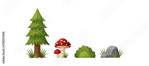 Cartoon nature elements with fir tree, mushrooms, bush, and rock