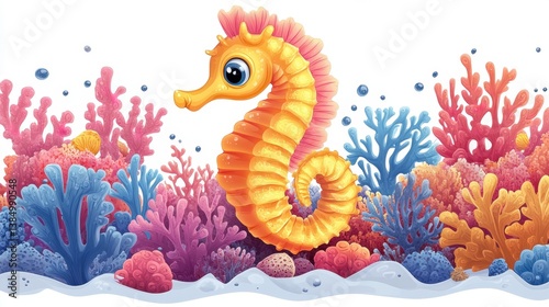 cartoon of a seahorse around of coral, isolated clear white background