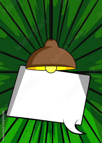 Cartoon pendant electric lamp with blank speech bubble, comic book Lighting Equipment background. Retro vector comics pop art design.