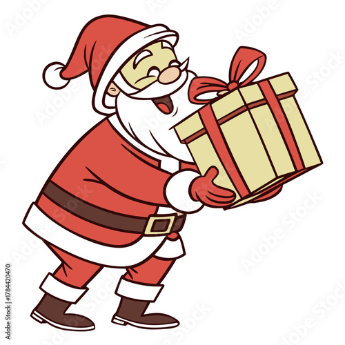 Cartoon santa claus holding a wrapped gift with a red ribbon and bow in a cheerful christmas scene
