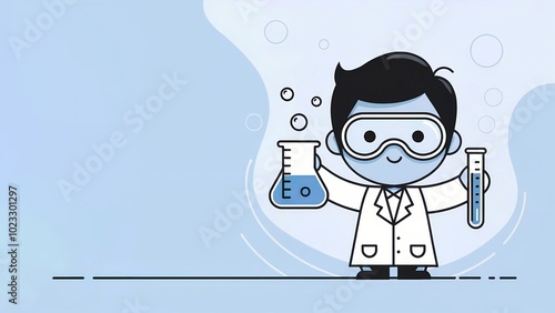 Cartoon scientist holding beaker and test tube in laboratory setting