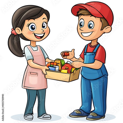 Cartoon smiling shopkeeper assisting a customer on a white background.