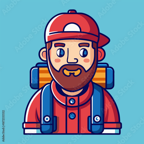 “Cartoon Vector Illustration of Bearded Traveler Man with Camera and Backpack”