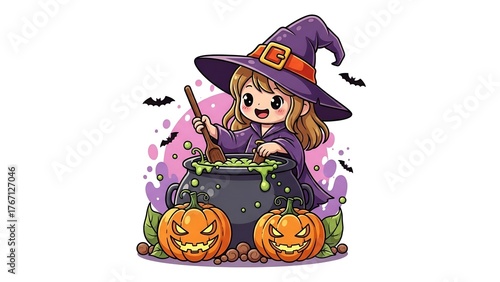 Cartoon witch stirring cauldron with pumpkins and bats illustration