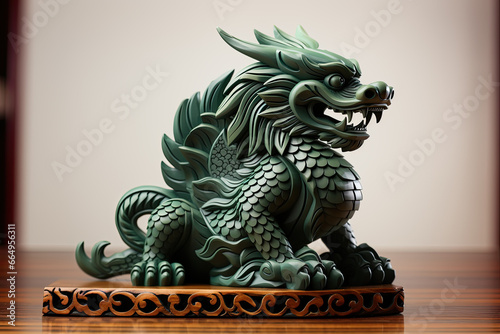 Carved green wooden dragon figurine on shelf at shop on light background