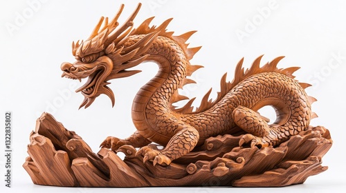Carved Wooden Dragon Statue on a Rock Base