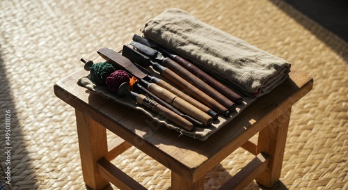 Carving tools on wooden stool