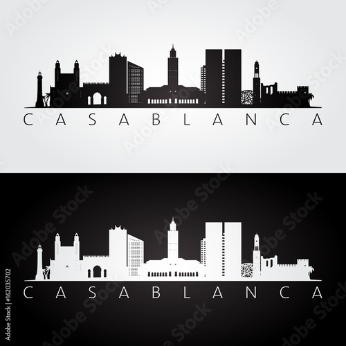 Casablanca skyline and landmarks silhouette, black and white design, vector illustration.