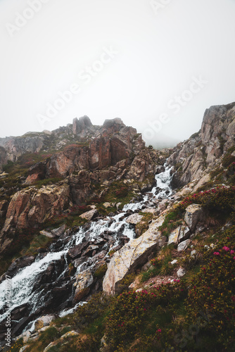 Cascade dans la brume en montagne